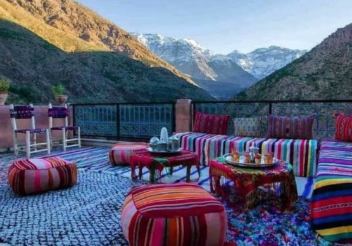 Travel from Marrakech to Armed, a traditional Berber village at the foot of the High Atlas and a popular base for treks around Jbel Toubkal. Along the way, stop in Imlil center for panoramic views and a refreshing tea in a Berber café. Continue through beautiful villages and visit the valley’s waterfalls before reaching Armed. In the evening, enjoy a homemade Berber dinner at a local guesthouse, with views of Mount Toubkal, and spend the night under a sky full of stars.