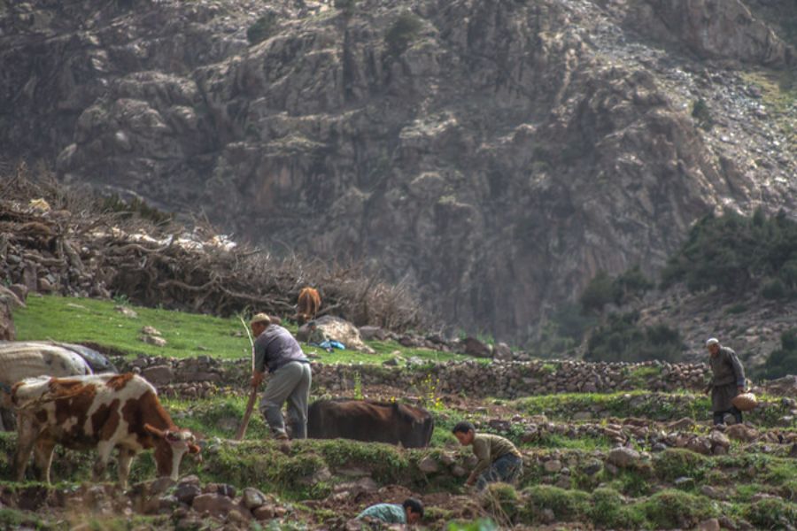 After breakfast in Marrakech, drive for 1h30 through Tahanout, Moulay Brahim, and Asni before arriving in Imlil, where your guide and mule team will be waiting. Once everything is loaded, begin the trek with an ascent to Tizi M’zik Pass (2,500m), offering sweeping views over the Imlil and Azzaden valleys. Stop for a picnic lunch under the shade of juniper trees while admiring the panorama. Continue your hike down to the impressive Tamsoult Waterfalls, the highest in the region, before retracing your steps toward Tizi M’zik and descending to the charming village of Tizi Oussem (1,850m). Capture unforgettable views of the Berber landscape before settling into a traditional guesthouse for dinner and overnight. Approx. 7 hours walking