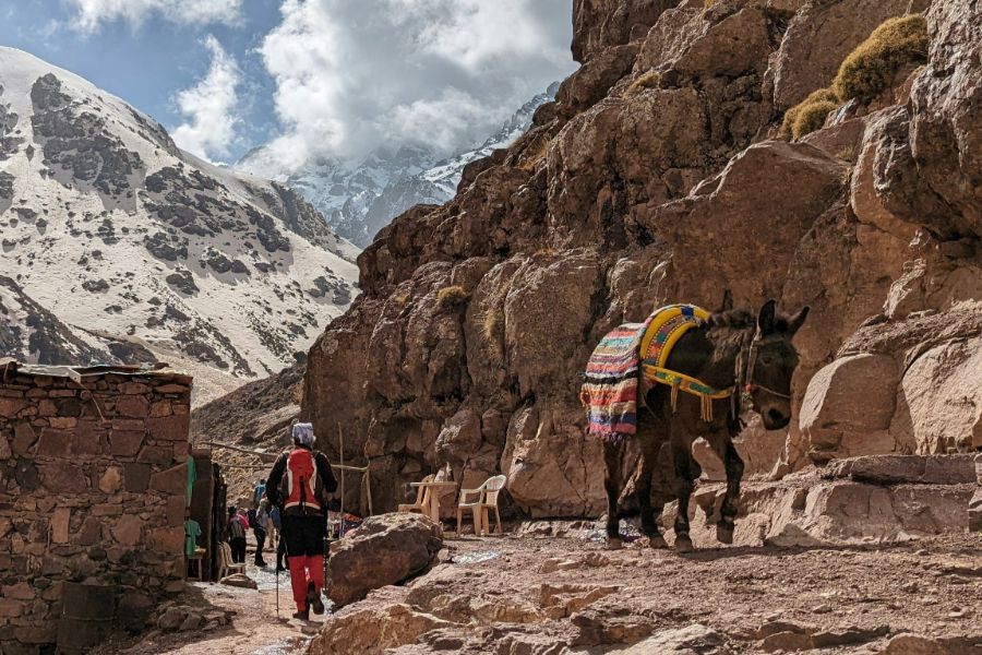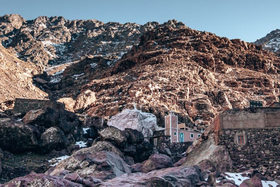 Pickup from your accommodation in Marrakech and drive (1h30) to Imlil Valley, the gateway to the High Atlas. From Aremd village, trek through the Ait Mizane Valley and continue toward the shrine of Sidi Chamarouch, a popular pilgrimage site beside a small waterfall. After lunch, the trail climbs steadily toward the Toubkal Refuge (3,206m), where you spend the night. Trek: 5–6 hours